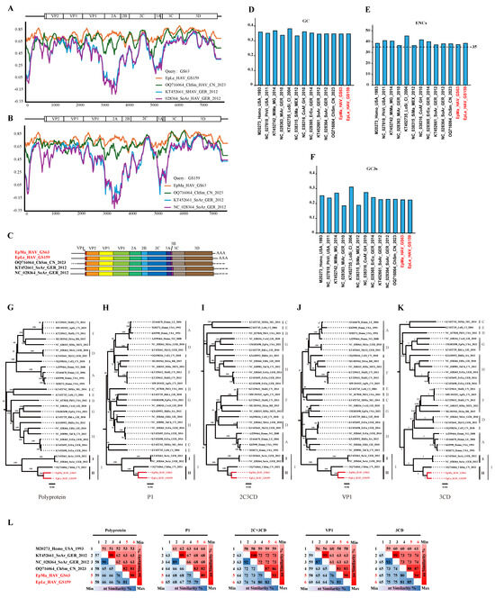 Properties of the genomes of novel shrew HepVs. (A) The results of sequences identity analysis on EpMa-HAV-GS63 using Simplot. (B) The results of sequences identity analysis on EpLe-HAV-GS159 using Simplot. (C) Shrew HepV genome organization. (D) Percentage of G + C content of HepV genomes. (E) The effective number of codons of HepV genomes. (F) The GC content of the third position of the synonymous codon of HepV genomes. (G–K) Maximum likelihood phylogenetic trees of amino acids for polyprotein (G), P1 (VP1–4) (H), 2C + 3CD (I), VP1 (J), and 3CD (K). (L) amino acid identity of shrew HepVs in polyprotein, P1 (VP1–4), 2C + 3CD, VP1, and 3CD (the novel shrew HepVs discov-ered in this study are presented in red, unmarked as unclassified Hepatovirus).