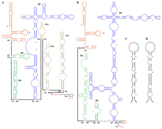 Conserved structural elements in the 5′ UTR of most HepVs include several pyrimidine-rich tracts and a large, predicted cruciform stem-loop resembling the type III HAV IRES [16]. However, the 5′ UTRs of viruses from EpMa-HAV-GS63 and EpLe-HAV-GS159 have some distinct characteristics of typical type III IRES (Figure 4A,B). EpMa-HAV-GS63 features a semicircular free loop in the body of the cruciform stem-loop and a small stem-loop structure at the proximal end of the long arm of its cruciform stem-loop (Figure 4A). In contrast, there is a T-shaped stem-loop in the body of the cruciform stem-loop of EpLe-HAV-GS159 (Figure 4B). Both EpMa-HAV-GS63 and EpLe-HAV-GS159 are predicted to have three domains, including domain I, domain II (consisting of two stem-loops: IIa and IIb), and domain III (cruciform stem-loop) (Figure 4A,B). However, EpMa-HAV-GS63 exhibits a domain IV (including IVa–IVc) consisting of three independently connected stem-loops before the initiation codon compared to EpLe-HAV-GS159 (Figure 4A).
