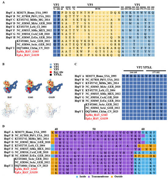 Human HAV harbors a conformation-dependent immunodominant neutralization site [7,30]. Residues S102, NK104–105, S114, V166, WV170–171, K221, and Q232 of VP1, as well as P65, DS 70–71, and Q74 of VP3, have been implicated in neutralizing epitopes; residues T71 and A198 of VP2 and 89–96 motifs of VP3 may harbor other epitopes (Figure 5A,B and Figures S2–S4). EpMa-HAV-GS63 and EpLe-HAV-GS159 shared 7 of these 13 conformation-dependent immunodominant neutralization site residues (Figure 5A,B). HepV-I clade II shrew HepVs have a four amino acids insertion in HepV 89–96 motifs of VP3 (Figure 5A). The YPX3L “late domain” motifs in VP2 that contribute to HepV membrane envelopment by mediating capsid interactions with components of the endosomal sorting complex required for transport (ESCRT) are highly conserved among HepVs (Figure 5B,C) [31].