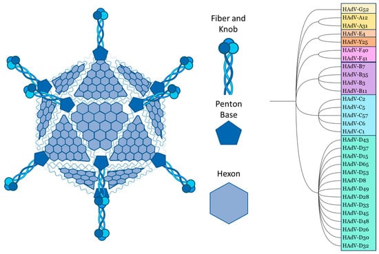 Adenovirus (Ad)-based vectors are popular tools for multiple clinical applications, as they are relatively easy to genetically manipulate, can be produced to high titers, and efficiently transduce cells. There is a broad range of Ad-based applications, with Ads developed as vaccine vectors, gene therapy vectors, and oncolytic virotherapy (OV) treatments. One of the most studied Ads in this context is human Ad type 5 (HAdV-C5), a species C Ad. However, to date, 7 different species (A–G) and over 50 distinct serotypes have been identified, which differ in structure, cell entry pathways, and pathogenesis [,,,].