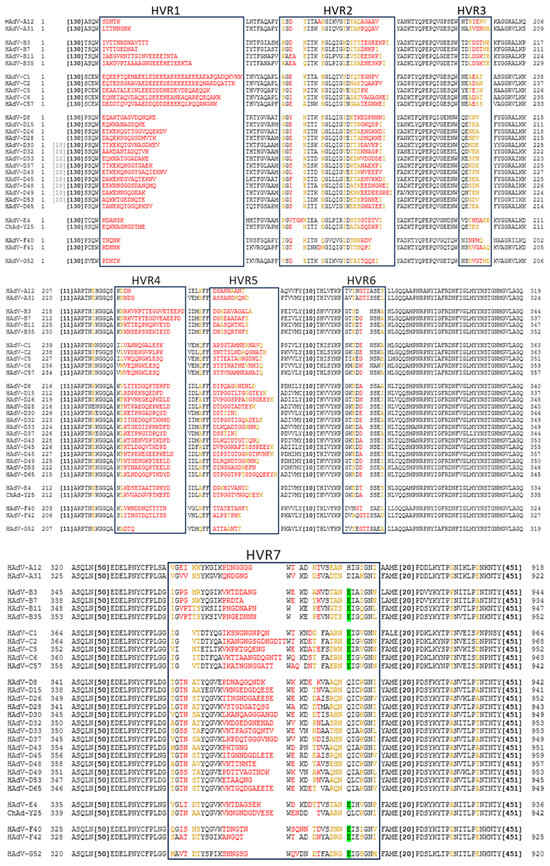 Comparison of Hexon HVRs and FX Binding Sites on Selected Ads of Different Species. Alignment created using NCBI COBALT multiple protein sequence alignment, using NCBI protein IDs. Amino acids in black are highly conserved, in yellow are partially conserved, and in red are hypervariable. The amino acid highlighted in green is most important in FX binding []. This model predicts no FX binding across species A and D. Large stretches of conserved sequence have been abbreviated (in brackets). All human Ads relevant to this review, as well as chimpanzee (Ch) Ad-Y25, are included in the selection.