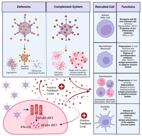 Interactions with components of the complement system further activate the anti-vector immune responses. Ad vectors can directly interact with C3 []. In the absence of C3, intravenously administered HAdV-C5 vectors cannot induce thrombocytopenia in mice, indicating that complement is involved in this response. Overall cytokine release and systemic inflammation were also reduced in C3 knockout mice [], which can be expected as C3 is involved in positive feedback loops activating the innate immune system (Figure 3). Tian et al. observed that in vivo in mice after intravenous application, complement mainly senses Ad vectors when they have already infected cells, as an HAdV-C5 vector defective in cell entry had a much-reduced complement response. In vitro, complement was able to interact with vector particles directly, causing a much larger response []. This is important to note, as it demonstrates that data on complement will likely have to be collected using in vivo experiments to provide accurate results. For example, the Ad hexon has also been implicated in binding IgG, which may further facilitate complement binding and neutralisation via the complement cascade. In vitro, this mechanism reduces Ad transduction via destruction by the classical complement cascade. In vivo, there appear to be other mechanisms involved as well []. As described earlier, signalling of activated cells of the innate immune system can increase complement activity (Figure 3), which would not be picked up by pure in vitro experiments.