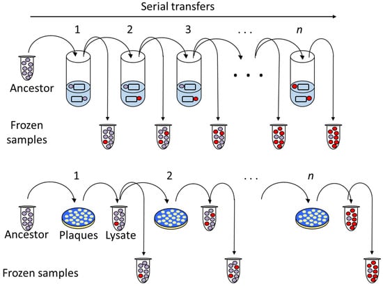 Schematics of evolution experiments using serial transfer of phage populations in the laboratory. Typically, an ancestral clone or population of phages (circles) is allowed to infect bacterial host cells under novel or control environmental conditions. At end of the passage (e.g., after 24 h of incubation), a sample of the phage population is transferred with dilution (e.g., 1:100, creating a bottleneck) into a fresh culture vessel with host cells, and a second sample is stored frozen to permit later analyses. Over time, the phage population is expected to fix mutations (red circles) that increase fitness (survival and/or reproduction) in the novel environment. (Top): Phages are serially transferred in liquid cultures containing bacterial host cells (rectangles). (Bottom): Phages are grown on lawns of bacterial hosts to form plaques (white circles, indicating zones of lysed bacterial cells). One or more plaques are collected to obtain a cell-free lysate, followed by plating with dilution onto a fresh host lawn.