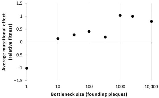 The relationship between bottleneck size during transfers in an evolution experiment (see Figure 1) and the average effect of mutations that reach high frequency in the population after 50–100 transfers. The average mutational effect was calculated as the total difference in fitness between the wild-type ancestor and the final population, divided by the estimated number of mutations. Data are from Table 1 of Burch and Chao 1999 [15].