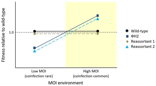 Hypothesized fitnesses of wild-type Φ6, ΦH2 (cheater), and hybrid reassortants containing one genomic segment of ΦH2 in the wild-type background when infecting host cells. ΦH2 performs worse than the wild-type Φ6 at a low MOI, but better than the wild-type Φ6 in a mixed, high-MOI infection. Reassortant 1 shows no evidence that its effect on host bacterial growth differs from that of the wild-type (i.e., the introduced genomic segment does not contain mutation(s) from ΦH2 for poor productivity at a low MOI or high productivity at a high MOI). By contrast, Reassortant 2 recapitulates the poor productivity of ΦH2 on host cells at a low MOI and its high productivity at a high MOI, suggesting that its introduced segment likely contains at least one mutation associated with these phenotypes in ΦH2.