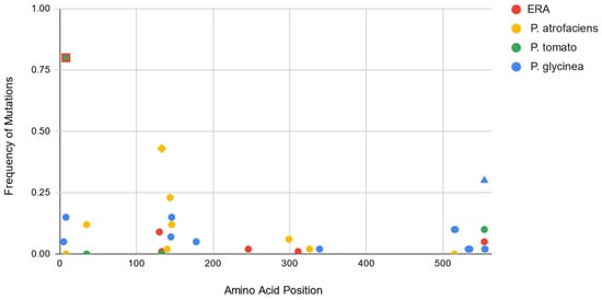Figure 5 shows that changes at the p3 locus relate to differing abilities for these mutants to infect certain host bacteria. Mutations at residue 8 (the square in Figure 5) occur at a higher frequency when Φ6 is challenged to infect ERA and P. tomato bacteria, while host shifts onto P. glycinea favor mutations at residue 554 (the triangle in Figure 5), and host shifts associated with P. atrofaciens emergence are favored by mutations at residue 133 (the diamond in Figure 5). According to a study that examined these mutations in light of the structure of the P3 protein, all three aforementioned amino acid changes were predicted to be topologically close together [50]. This region of the protein may have a particular functional role in the attachment of Φ6 to host cells, with different amino acid replacements responsible for specific changes in the host range.
