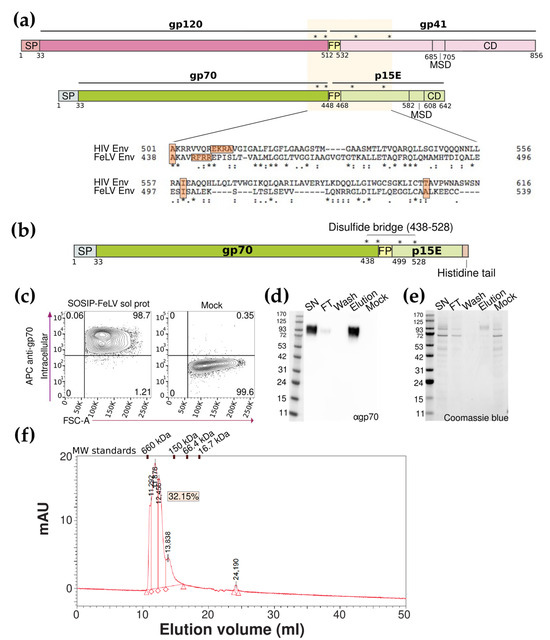 Generation of a soluble stable Env trimer. (a) Schematic representation of HIV and FeLV Env glycoproteins, mutations of SOSIP strategy are indicated by asterisks. Alignment between HIV and FeLV Env glycoproteins. (b) The schematic representation of the SOSIP FeLV soluble protein. Signal peptide (SP), mutations (indicated by asterisks), disulfide bridge, and histidine tail are denoted. (c) Representative flow cytometry panels for the total expression of the SOSIP-FeLV soluble proteins detected with an anti-gp70 antibody. (d) The Western blot analysis of the different fractions of the SOSIP-FeLV soluble protein purification developed with an anti-gp70 antibody. (e) The Coomassie blue analysis of the different fractions of the SOSIP-FeLV soluble protein purification. (f) Chromatogram using the SE-HPLC of the SOSIP-FeLV soluble protein.