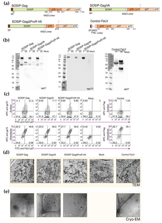 Having confirmed the expression and oligomerization state of the SOSIP-FeLV protein, we designed, produced, and characterized FeLV Gag-based VLPs exposing the SOSIP-FeLV protein on the surface of the particle. Three different recombinant fusion proteins were designed. All the fusion proteins contained the SP of FeLV Env and the above-described SOSIP-FeLV Env without the Histidine tail, which was replaced by the FeLV Env MSD fused to different forms of FeLV Gag. Based on our previous work to optimize FeLV Gag-based VLP formation [30], the following fusion proteins were tested: (i) SOSIP-Gag, containing wild-type FeLV Gag; (ii) SOSIP-GagVA, containing two mutations at residues L199V and R200A in FeLV Gag; and (iii) SOSIP-GagΔProR-VA, containing a deletion of a late domain-containing region (residues 128 to 153 in FeLV Gag), in addition to the double VA mutation (Figure 2a). Moreover, a control FeLV Gag-based VLP without extracellular FeLV antigens, but with a signal peptide, a Flag-tag, the FeLV Env MSD, and full-length FeLV Gag was designed as a control for immunization assays (control FeLV, Figure 2) [30].
