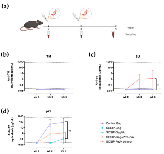 Immunogenicity of the SOSIP-FeLV Gag-based VLPs in C57BL/6. (a) The graphical scheme of the experimental procedure. Antibody titers against FeLV TM (b), FeLV SU (c), and FeLV p27 (d) are shown. Data are presented as Median with 95% CI of antibody concentration in mouse sera. Statistical differences were found using the Peto/Peto rank test for week 6 (* p < 0.05; ** p < 0.01).