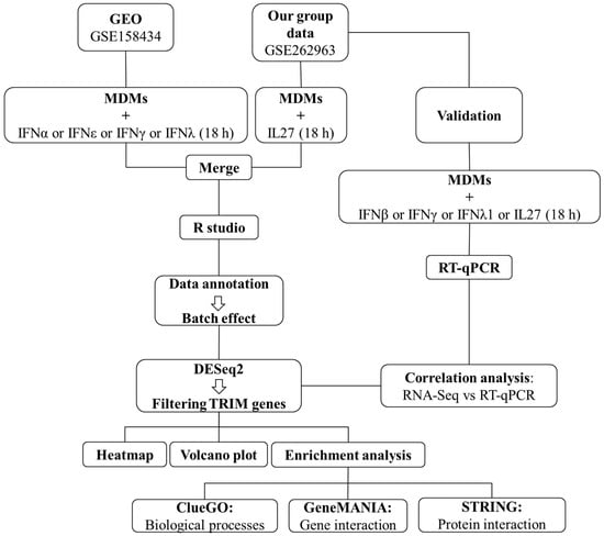 To explore the expression of TRIMs in MDMs treated with IFNα, IFNε, IFNγ, IFNλ, and IL27, we re-analyzed two RNA-seq datasets. The first RNA-seq dataset consisted of MDMs treated with IFNs, was downloaded from the Gene Expression Omnibus (GEO) database under accession number GSE158434, and was analyzed following the workflow described in Figure 1. This was obtained from MDMs, either untreated or treated with 25 ng/mL of IFNα, IFNε, IFNγ, or IFNλ (n = 3) for 18 h. The second RNA-seq dataset (accession number GSE262963) was generated from our own research on MDMs treated with 25 ng/mL of IL27 (n = 3) for 18 h. Untreated cells were used as a control.