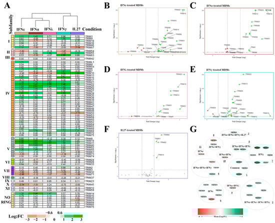 To identify the top differentially expressed TRIM genes (DETGs), we utilized the DESeq2 library [69] and calculated the Log2Fold Change (FC) (Treatment/Control). Subsequently, we plotted a heatmap of the FC for TRIM genes using the pheatmap library and generated volcano plots using the ggplot2 library in R [64]. The criteria applied for the volcano plots were a false discovery rate (FDR) < 0.05 and a FC > 0.6 [25,43,44]. Finally, we used Cytoscape 3.9.1 software [70] to visually represent the common genes among the transcriptomes of MDMs treated with IFNα, IFNε, IFNγ, IFNλ, and IL27.