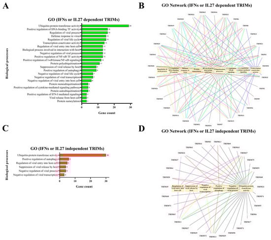 DEGs expression of IFNs or IL27-dependent or independent TRIM in MDMs. The following RNA-seqs were reanalyzed: GSE262963 (GEO) for MDMs treated or not with IL27; GSE158434 (GEO) for MDMs treated or not with IFNα, IFNε, IFNγ, IFNλ. Gene Ontology (GO) analysis was achieved in Cytoscape using the plugin ClueGO. Each GO diagram shows the common biological processes implicated in IFNs or IL27-dependent TRIMs (A) and the common biological processes implicated in IFNs or IL27-independent TRIMs (B). The number of genes regulated (the gene count) is shown for each biological process. Each GO network was realized using Cytoscape, which displays each TRIM involved in IFN or IL27-dependent biological processes (C) and the TRIM involved in IFN or IL27-independent biological processes (D). Each biological process is represented by an edge of a specific color.