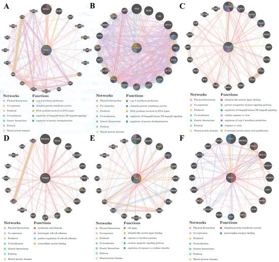 The gene-gene interaction network of TRIM significantly up-regulated the transcripts of MDMs from the transcriptomic analysis. Each network of significantly up-regulated TRIM genes, such as TRIM21 (A), TRIM22 (B), TRIM25 (C), TRIM69 (D), TRIM19/PML (E), and TRIM31 (F), was obtained from GeneMANIA. The functions of the genes are represented by colored sections in the circle nodes, with the corresponding functions indicated in the legend labeled “Functions” using a color code. Meanwhile, the types of interactions between genes are represented by the color of the lines, and the legend labeled “Networks” provides a color code for understanding the different types of interactions. Additionally, the size of each node corresponds to the strength of the interaction.