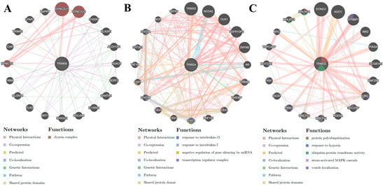The gene-gene interaction network of TRIM significantly down-regulated the transcripts of MDMs from the transcriptomic analysis. Each network of significantly down-regulated TRIM genes, such as TRIM58 (A), TRIM24 (B), and TRIM32 (C), was obtained from GeneMANIA. The functions of the genes are represented by colored sections in the circle nodes, with the corresponding functions indicated in the legend labeled “Functions” using a color code. Meanwhile, the types of interactions between genes are represented by the color of the lines, and the legend labeled “Networks” provides a color code for understanding the different types of interactions. Additionally, the size of each node corresponds to the strength of the interaction.
