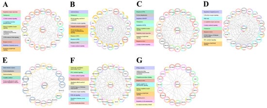 Protein-protein interaction network of TRIM-regulated transcripts of MDMs from the transcriptomic analysis. The STRING output shows 20 interactors for each analysis based on the selected TRIM and its confidence threshold. TRIM21 with 0.7 of confidence (A), TRIM22 with 0.4 of confidence (B), TRIM25 with 0.7 of confidence (C), TRIM19 with 0.7 of confidence (D), TRIM31 with 0.7 of confidence (E), TRIM24 with 0.7 of confidence (F), and TRIM32 with 0.7 of confidence (G). Nodes are proteins; the edges represent protein-protein interactions contributing to a shared function. The full donut represents the functional enrichment analysis.