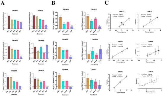 To further validate the transcriptome sequencing results, six DETGs were selected for RT-qPCR analysis. Among them, we included TRIM19, TRIM21, and TRIM22, which were induced by IL27 as well as all three types of human IFNs; TRIM25, which was induced only by IFNs but not by IL27; and TRIM69, which was induced only by IFN-I, IFN-II, and IL27 but not by IFN-III. For this purpose, MDMs were treated with recombinant human IL27 or IFNβ, IFNε, IFNγ, or IFNλ1, or recombinant human IL27, and the cells were harvested at 18 h post-treatment. Consistent with the results of RNA-Seq datasets (Figure 7A), most of the six TRIM genes exhibited similar mRNA expression levels to what was observed in the transcriptomic analysis, mainly for IFN-dependent TRIM genes (TRIM21, 22, 25, 19, and 31; Figure 7B). Furthermore, a significant correlation between RNA-Seq and RT-qPCR for TRIM19 (R = 0.9971; p = 0.001437), TRIM21 (R = 0.8652; p = 0.069821), TRIM22 (R = 0.9019; p = 0.050307), TRIM25 (R = 0.9983; p = 0.000838), TRIM31 (R = 0.8628; p = 0.071127), and TRIM69 (R = 0.9905; p = 0.004775) was observed (Figure 7C), suggesting a strong concordance between bulk RNA-Seq data and RT-qPCR results.