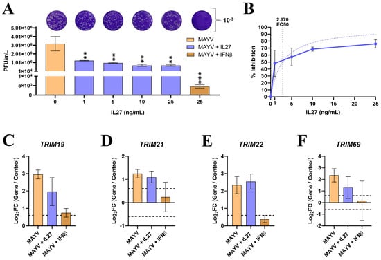 To determine the effect of IL27 stimulation of MDMs on viral replication, MDM cultures were stimulated with increasing concentrations of IL27 or 25 ng/mL IFN-β. Subsequently, cells were infected with MAYV, and viral replication was evaluated at 24 h.p.i by plaque assay on Vero cells. As previously reported [74], MDMs were susceptible to MAYV infection and released many infectious viral particles at 24 h.p.i (Figure 8A). To highlight, the treatment of MDMs with IL27 significantly decreased the release of infectious viral particles in a concentration-dependent manner compared to MAYV-infected control cells, indicating a decrease in MAYV replication. Notably, IFNs induced a higher control over MAYV replication than IL27 (Figure 8A). To obtain a detailed insight into the efficacy of IL27 against MAYV, we next determined the dose-response curve. We calculated the EC50 value, which reflects the concentration of IL27 required to decrease infectious virus particle production by 50%. As observed in Figure 8B, the EC50 value for IL27 was 2.870 ng/mL following infection at MOI 0.5. We next evaluated if the treatment with IL27 and IFN-β induces the expression of TRIM19, 21, 22, and 69 in MAYV-infected MDM (Figure 8C–F). To this end, based on the plaque assay and EC50 results, we treated the MDM with 10 ng/mL of IL27 or 25 ng/mL of IFN-β. Subsequently, the cells were infected with MAYV, as described above. We observed higher mRNA levels of TRIMs in response to IL27 treatment, with TRIM22 (Figure 8E), 19 (Figure 8C), 21 (Figure 8D), and 69 (Figure 8F) showing increased expression compared with IFN-β. Notably, the levels of TRIM 69, 22, and 21 were below the threshold we consider significant following IFN treatment and MAYV infection. Furthermore, MAYV infection also promotes the expression of the four TRIMs evaluated at levels very similar to those obtained with IL27 (Figure 8C–F).