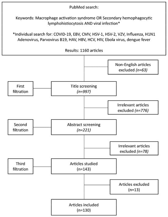 We performed a literature review, searching the Pubmed database from September 2003 until May 2024 for viral infections associated with MAS. We used the terms “Macrophage activation syndrome” OR “secondary hemophagocytic lymphohistiocytosis” AND the viral infection of interest, including “COVID-19”, “EBV”, “CMV”, “HSV-1”, “HSV-2”, “VZV”, “Influenza”, “H1N1” “Adenovirus”, “Parvovirus B19”, “HAV”, “HBV”, “HCV”, “HIV”, “Ebola virus”, and “dengue fever”. Relative publications were identified by their abstracts and title by two independent reviewers. Respective articles were also hand-searched for relative references. Only English articles were studied. Duplicates and non-human articles were excluded, as well as articles irrelevant to virus-associated MAS, such as papers inconclusive about MAS triggers or sHLH associated with etiology other than infection. Case reports were excluded. In the absence of relevant findings, and following extensive discussion, the authors decided that, for the sake of information completeness, case reports would be recorded in a table for parvovirus-B19 only. The results were discussed and disagreements resolved. A study flowchart is shown in Figure 1.