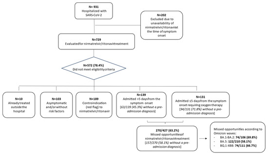 The proportion of missed opportunities for early nirmatrelvir/ritonavir treatment was evaluated overall and by stratification on the basis of the period of hospital admission.