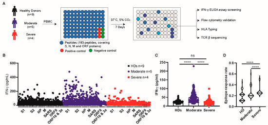 T cells of patients with moderate disease had a robust response towards SARS-CoV-2 antigens. (A) A schematic showing the overall study design. (B) IFN-γ in supernatant of cultured PBMCs from HD and COVID-19 patients with moderate or severe disease were assessed by ELISA, and antigen information was labeled along the X axis. (C) The mean value of IFN-γ concentration of cultured PBMCs from HD and COVID-19 patients with moderate or severe disease induced by each peptide assessed by ELISA. (D) Violin plot showing the response rate of each peptide in HD and COVID-19 patients with moderate or severe disease, two times higher IFN-γ concentration than the unstimulated sample was recognized as a positive response. S1: spike S1 domain; S2: spike S2 domain. Data are expressed as mean ± SD. and **** p < 0.0001 by two-tailed Mann–Whitney U-test. ns, non-significant.