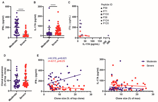 T-cell response of patients with severe disease produced higher levels of IL-17A. (A,B) IFN-γ (A) and IL-17A (B) of the positive-response sample was assessed by ELISA assay. (C) Spearman’s rank correlation between IFN-γ and IL-17A concentration in the supernatant of 6 representative samples was shown in dot plot. The dot shapes indicated representative peptides, the red indicated patients with severe disease, and the blue indicated patients with moderate disease. (D) The top TCR clone (immunodominant TCR β chain V-J gene pair) was analyzed between patients with moderate and severe disease. (E) Spearman’s rank correlation of the top TCR clone and IFN-γ or IL-17A was analyzed between patients with moderate and severe disease. Data are expressed as mean ± SD. **** p < 0.0001 by two-tailed Mann–Whitney U-test.