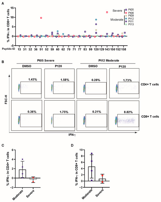COVID-19 patients broadly recognized the conserved P120 peptide. (A) The short-term cell line was incubated with 20 peptides (10 ug/mL) for 5 h, and IFN-γ expression was measured by flow cytometry. (B) Representative flow cytometry results of IFN-γ expression in CD4+ or CD8+ T cells induced by P120 peptide in patients with moderate and severe disease. (C,D) The P120-specific CD4+ or CD8+ T-cell level was analyzed by flow cytometry. The value of antigen-specific T cells was calculated by subtracting the negative control. Data are expressed as mean ± SD.