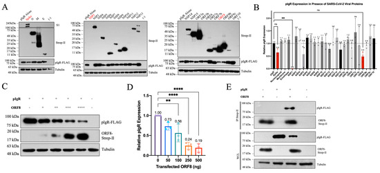 SARS-CoV-2 ORF8 downregulates pIgR in a dose-dependent manner. (A,B) HEK293T cells co-transfected with 500 ng pIgR plasmid DNA; 250 ng plasmid DNA expressing SARS-CoV-2 structural, non-structural (nsp), or accessory proteins; and 250 ng QCXIP empty vector in 6-well plates. (C,D) HEK293T cells co-transfected with 500 ng pIgR plasmid DNA and a titration of SARS-CoV-2 ORF8-Strep-II plasmid DNA (0 ng (-), 50 ng (+), 100 ng (++), 250 ng (+++), 500 ng (++++)) and QCXIP DNA. (E) HEK293T cells co-transfected with 2500 ng pIgR, 1250 ng ORF8-Strep-II, and 1250 ng QCXIP plasmid DNA in a 10 cm dish. Whole cell lysates were harvested and analyzed for pIgR-FLAG (anti-FLAG), SARS-CoV-2 proteins, and ORF8-Strep-II (anti-Strep-II), spike (anti-spike), and tubulin (anti-tubulin) by Western blots. Protein expression was quantified using Fiji and analyzed with Prism V9 (mean with SD; statistical significance measured via one-way ANOVA; ns (not significant) p 0.05, ** p 0.01, **** p 0.0001).