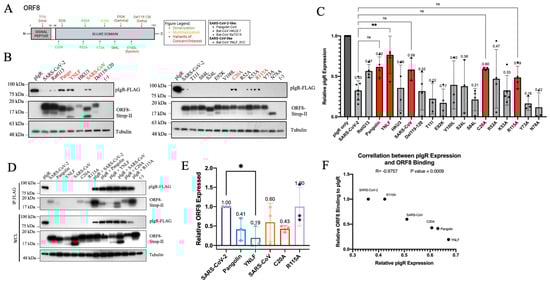 ORF8 from SARS-CoV-2 mutants, variants, and animal CoVs interact differently with pIgR. (A) Schematic of ORF8 mutagenesis. (B,C) HEK293T co-transfected with 500 ng pIgR; 250 ng QCXIP; and 250 ng mutant, variant, and animal CoV ORF8 proteins. (D,E) HEK293T co-transfected with 2500 ng pIgR; 1250 ng QCXIP; and 1250 ng pangolin, YNLF, SARS-CoV, C20A, and R115A ORF8 proteins. (F) Correlation analysis performed on PrismV9. (B–E) Protein expression was quantified using Fiji and analyzed with Prism V9 (mean with SD; statistical significance measured via one-way ANOVA; ns (not significant) p 0.05, * p 0.05, ** p 0.01).