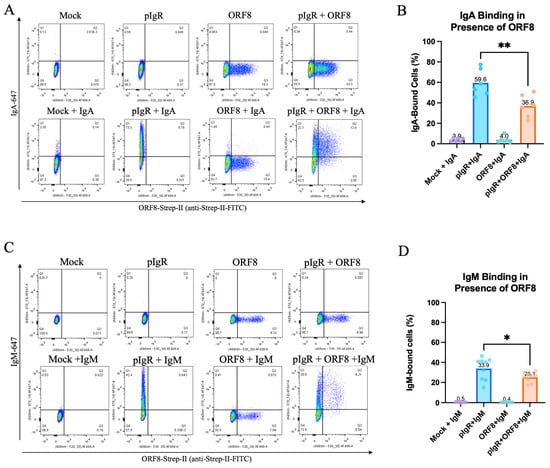 To assess the functional impact of ORF8’s downregulation of pIgR, we investigated whether ORF8 expression inhibited the binding of dIgA or pIgM to the cell surface pIgR. Hence, we incubated HEK293T cells co-expressing pIgR and ORF8 with dIgA or pIgM and measured their binding by flow cytometry. As expected, we found that intracellular ORF8 decreased the binding of both total dIgA and pIgM to pIgR-expressing cells (Figure 3). Specifically, ORF8 reduced the mean dIgA binding to pIgR-expressing cells from 59.6% in control cells to 36.9% in ORF8-expressing cells (Figure 3A,B). As for pIgM, the mean binding to pIgR-expressing cells dropped from 33.9% in control cells to 25.1% as a result of ORF8 expression (Figure 3C,D). These results support the capacity of intracellular ORF8 to diminish the binding of dIgA or pIgM to pIgR.