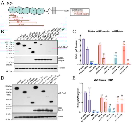 We next investigated which domains of pIgR mediated downregulation by ORF8 by generating a panel of pIgR mutants with the deletion of the extracellular domains (Figure 4A). Since ORF8 is a luminal protein and secreted, it more likely interacts with pIgR’s extracellular domains [39,40,41]. We therefore removed these extracellular domains in a sequential manner and generated deletions of domain 1 (ΔD1), domains 1 through 2 (ΔD1–2), domains 1 through 3 (ΔD1–3), domains 1 through 4 (ΔD1–4), and domains 1 through 5 (ΔD1–5) (Figure 4A). When these mutants were expressed in HEK293T cells, ΔD1, ΔD1–3, and ΔD1–4 were very poorly expressed ΔD1–2, and D1–5 showed sufficiently high levels of expression for the test of their sensitivity to downregulation by ORF8. Interestingly, both ΔD1–2 and ΔD1–5 were downregulated by ORF8 similarly to the WT pIgR (Figure 4B,C). Consistent with its weak downregulation of the WT pIgR, the C20A ORF8 mutant did not markedly affect the expression levels of ΔD1–2 and ΔD1–5 (Figure 4D,E). Therefore, the folded extracellular domains of pIgR are dispensable for ORF8-mediated downregulation, and C20-mediated ORF8 dimerization is critical in downregulating pIgR.
