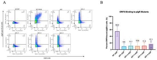 Secreted ORF8 interacts with D1 of pIgR. (A,B) HEK293T cells were transfected with 250 ng pIgR or pIgR mutants and treated with 10 μg/mL ORF8-488 for 30 min on ice. Cells were stained with anti-FLAG (pIgR) and analyzed by flow cytometry. Data were analyzed by PrismV9 (mean with SD; statistical significance was measured via one-way ANOVA).