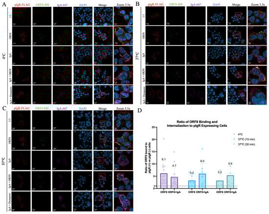 We then washed off the unbound ORF8 or dIgA and switched cells to 37 °C to allow endocytosis to occur (Figure S1). After 15 min incubation, ORF8 or dIgA was individually localized and agglomerated close to the plasma membrane (Figure 6B). Similarly, the co-incubation of ORF8 and dIgA together led to large punctates near the plasma membrane, likely indicating the localization of both proteins to the same pIgR-rich regions in preparation for internalization (Figure 6B). This is in agreement with early studies reporting that dIgA binding leads to pIgR’s homotypic dimerization and crosslinking, which can trigger the internalization of the dIgA–pIgR complex [42]. Continued incubation at 37 °C for 30 min did not permit the internalization of ORF8 but did lead to the observation of small intracellular dIgA punctates overlapping with the pIgR signals, suggesting the successful endocytosis of the dIgA–pIgR complex but not ORF8 (Figure 6C). Interestingly, when ORF8 was co-incubated with dIgA, large intracellular punctates containing ORF8, dIgA, and pIgR were recorded (Figure 6C). These intracellular IgA/ORF8 signals were not detected when dynasore was used to block endocytosis (Figure 6). Furthermore, we confirmed that ORF8 was three to six times more likely to bind pIgR-expressing cells than pIgR-naïve cells, especially in the presence of dIgA (Figure 6D). These results suggest that ORF8 can bind to cell surface pIgR, but this binding itself does not trigger pIgR’s internalization; however, ORF8 can enter cells together with the dIgA–pIgR complex.