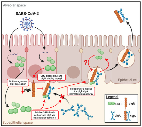 SARS-CoV-2 ORF8 modulates pIgR expression and highjacks the dIgA–pIgR pathway for internalization. Graphical abstract demonstrating the main pathways of pIgR modulation by SARS-COV-2 ORF8. Within cells, ORF8 downregulates pIgR expression, leading to decreased cell surface dIgA binding. In contrast, soluble ORF8 interacts with and highjacks the dIgA–pIgR complex to enter cells (as indicated by the red arrows and “× ”). Whether the immunomodulation of pIgR by ORF8 leads to an antagonized sIgA response remains to be investigated (as indicated with “?”). Created with biorender.com (accessed on 16 April 2024).