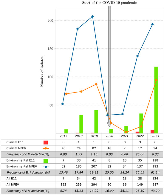 In total, 1197 NPEV isolates were collected at the National Institute of Public Health, NIH-NRI (NIPH NIH-NRI) in Poland, including 266 E11 isolates (266/1197; 22.22%), during 2017–2023. Most of the E11 came from environmental samples. The environmental strains of E11 accounted for 30.36% of the total NPEV isolated from sewage samples (255/840); the clinical strains of E11 represented only 3.08% of the total NPEV isolated from clinical samples (11/357). E11 was detected during each of the reported years. The number of isolated E11 isolates varied in particular years (Figure 1). The lowest number of E11 isolates, both clinical and environmental, was observed in 2017, and the highest was observed in 2023. The number of E11 isolates increased significantly from 2017 (n = 7) to 2023 (n = 124), representing 5.74% and 43.20% of the total number of isolates detected for the respective years. NPEV isolations, including E11, during the COVID-19 pandemic, especially during 2020 and 2021, were considerably lower than those after and before the pandemic. E11 was not detected in clinical samples during 2020 and 2021 at NIPH NIH-NRI, suggesting that a reduced transmission of E11 occurred during the intense phases of non-pharmaceutical interventions and social mitigations of COVID-19 in Poland.