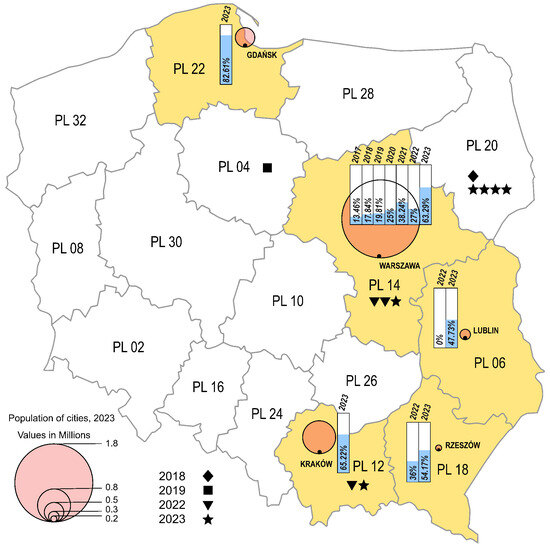 Frequency of E11 detection in Polish regions, 2017–2023. The voivodeships in which environmental surveillance was carried out are marked in yellow. Each city monitored by environmental surveillance is represented by a circle, with the size proportional to the population of the city (Warsaw—1.8 million; Krakow—0.8 million; Gdansk—0.5 million; Lublin—0.3 million; Rzeszów—0.2 million). Symbols (star, triangle, square, diamond) mark cases of E11 infections. The percentage of environmental E11-positive samples is shown in the bar charts.