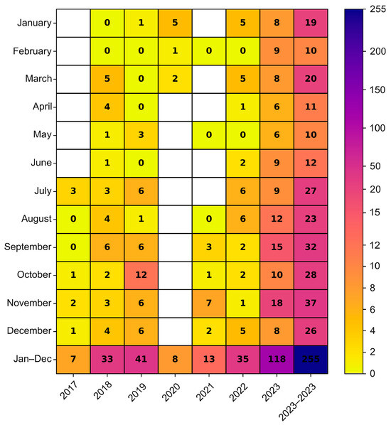 Monthly distribution of E11 isolated from environmental samples in Poland, 2017–2023. The number of environmental Polish E11 isolates detected by months was given in cells.