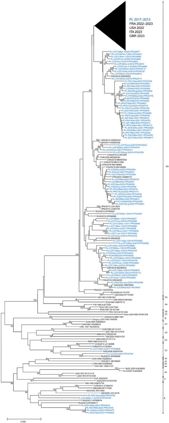In this study, phylogenetic analysis showed that E11 isolates from 2017 to 2023 belong to three genotypes, C3, D5 and E. Polish isolates of genotypes C3 and E were found only in sewage, while D5 isolates were detected in both sewage and human samples. The D5 genotype was predominant in Poland during 2017–2023 and was consistently detected over a 7-year research period. The close relationship between the Polish D5 strains and European clinical strains suggests sustained circulation in the region during the study period. Previous studies reported the detection of D5 on four different continents, indicating the cosmopolitan nature of this genotype [32]. Severe cases of multisystemic infection in newborns in Europe during 2022–2023 were linked to a new variant of this genotype [29]. The emergence of a new enterovirus variant may stem from either the introduction of a new virus from a geographically distinct area or the genetic evolution of an endemic virus population. Phylogenetic analysis suggests that the new E11 variant emerged from an endemic circulating population through evolutionary processes.