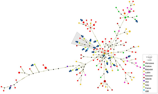 Median-joining haplotype network of 150 D5 genotype sequences constructed in PopArt. The analysis is based on entire VP1 gene sequences (876 nt) from clinical and environmental isolates collected in Poland from 2017 to 2023, as well as from other countries during 2022–2023. Each circle represents a unique haplotype, and its size reflects the number of strains expressing that haplotype. Crosshatches indicate the number of nucleotide differences between haplotypes. Color codes denote the geographic location of the strains. Clinical isolates are marked with arrows. The group of strains associated with severe E11 infections is marked with a gray triangle.
