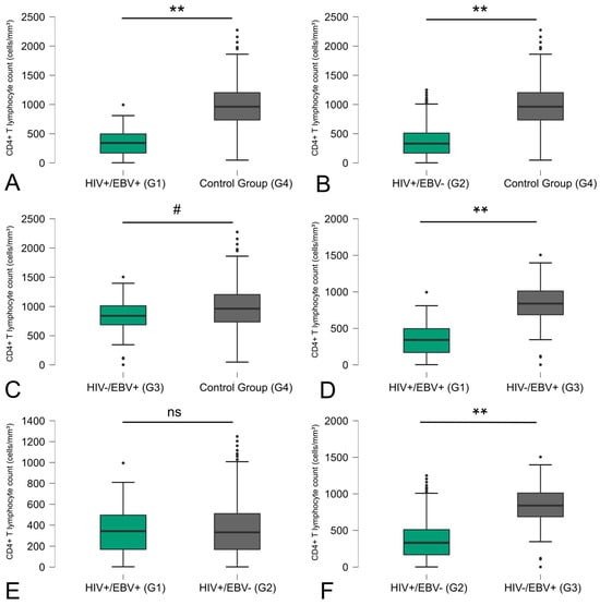 The comparison between groups regarding the counts of T CD4+ and CD8+ lymphocytes revealed significant differences. Concerning the CD4+ T lymphocyte count, disparities were observed in all comparisons made in relation to the control group: coinfected versus control (p < 0.01) (Figure 1A), HIV+/EBV− versus control (p < 0.01) (Figure 1B), and HIV−/EBV+ versus control (p < 0.05) (Figure 1C). Additionally, significant differences were found between the coinfected group (Figure 1E) and those who were EBV mono-infected (p < 0.01) (Figure 1D) and between individuals with HIV mono-infection and those who were EBV mono-infected (p < 0.01) groups (Figure 1F).