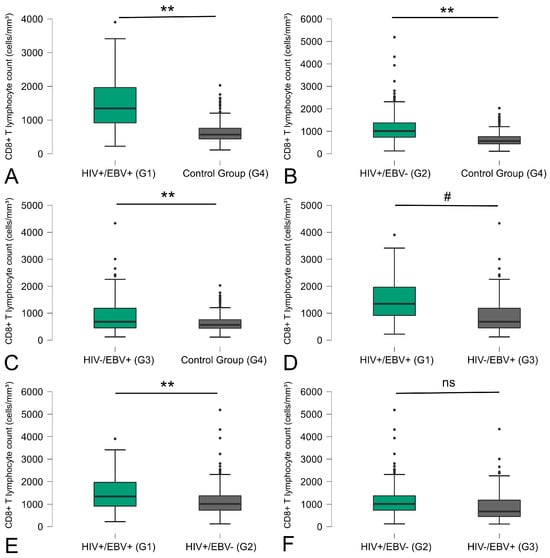 Comparative distribution of CD8+ T-cell counts between the study groups. The p-values are calculated using the Kruskal–Wallis test and are adjusted for multiple comparisons using the Bonferroni correction. ** p < 0.01; # p < 0.05; ns: not significant.