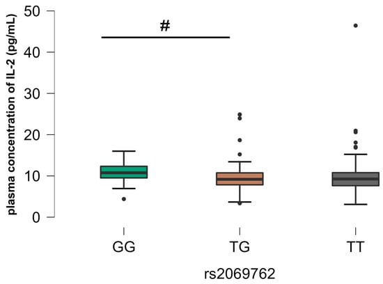 Comparative analysis between SNP rs2069762 and plasma IL-2 concentration, group G2. The p-values are calculated using the Kruskal–Wallis test and are adjusted for multiple comparisons using the Bonferroni correction. # p < 0.05.