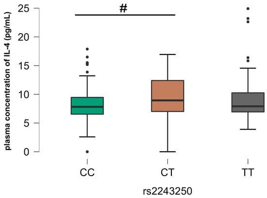Comparative analysis between SNP rs2243250 and plasma IL-4 concentration, group G4. The p-values are calculated using the Kruskal–Wallis test and are adjusted for multiple comparisons using the Bonferroni correction. # p < 0.05.