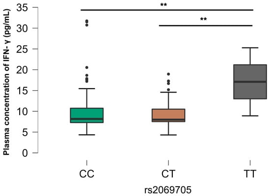 Comparative analysis between SNP rs2069705 and plasma IFN-y concentration, group G4. The p-values are calculated using the Kruskal–Wallis test and are adjusted for multiple comparisons using the Bonferroni correction. ** p < 0.01.