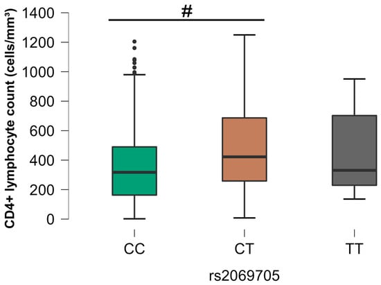 Comparative analysis between SNP rs2069705 and CD4+ T lymphocyte count, group G2. The p-values are calculated using the ANOVA test and are adjusted for multiple comparisons using the Bonferroni correction. # p < 0.05.