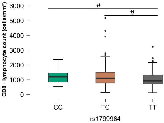 Comparative analysis between the SNP rs1799964 (TNF) and the CD8+ T lymphocyte count, group G2. The p-values are calculated using the Kruskal–Wallis test and are adjusted for multiple comparisons using the Bonferroni correction. # p < 0.05.