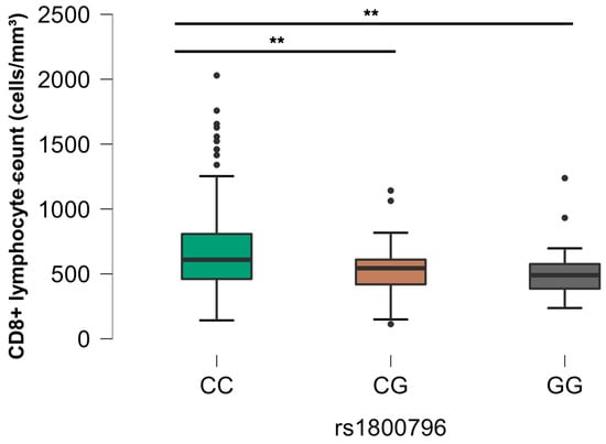 Comparative analysis between SNP rs1800796 (IL6) and CD8+ T lymphocyte count, control group (G4). The p-values are calculated using the Kruskal–Wallis test and are adjusted for multiple comparisons using the Bonferroni correction. ** p < 0.01.
