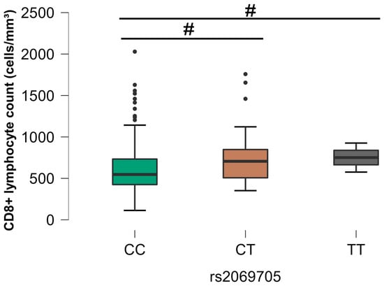 Comparative analysis between SNP rs2069705 (IFNG) and CD8+ T lymphocyte count, control group (G4). The p-values are calculated using the Kruskal–Wallis test and are adjusted for multiple comparisons using the Bonferroni correction. # p < 0.05.