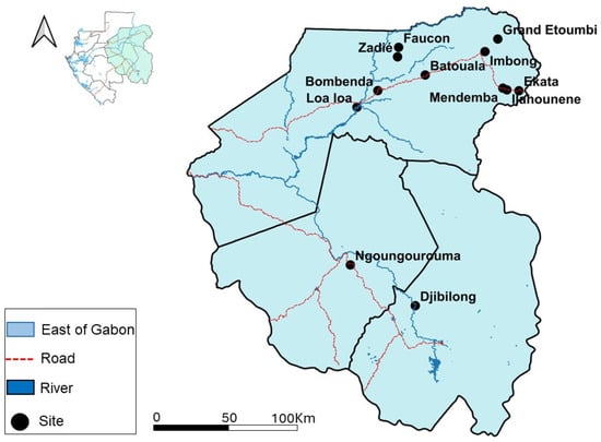 Distribution of bat collection sites in eastern Gabon. The black dots represent the collection sites.