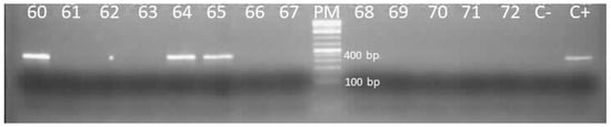Migration of second-round PCR products obtained after amplifying a portion of the S gene. Sixty, 64, 65: positive samples; 61, 62, 63, 66, 67, 68, 69, 70, 71, 72: negative samples; PM: 100 bp molecular weight marker; C+: positive control; C-: negative control; bp: base pair.