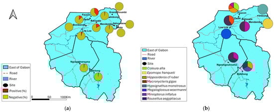 Some parameters such as sex, age (juvenile, subadult, and adult), and season were recorded. Individuals found clinging to their mother’s nipples or body (approximately less than 3 months) were considered juveniles; those in whom the sexual organs (testicles for males and nipples for females) were poorly developed (at least 6 months) were considered subadults; and individuals with well-developed external morphology and sexual organs were classified as adults. All bat species were identified morphologically during the collections using the identification keys specific to African bats []. For some bats, morphological identification had been confirmed through genetic identification as previously described [].